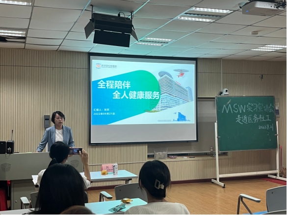 9月21日晚七点,社会工作系周舒老师邀请武汉儿童医院和武汉亚心总医院的医务社工们走进校园,面向2022级社工专业硕士研究生,召开实习宣讲会。