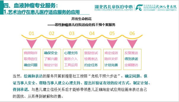 其次,张社工讲解了如何在医院这个特殊场域中开展一线医务社工实务。根据多年的实务工作经验,武汉儿童医院最终确立“立足慢病、大病病区、覆盖全院”的服务模式。医务社工的日常工作,包括开展患者探访与评估、专科查房、医疗适应、心理干预、临终关怀等服务。另外,还精心打造了“为爱捐发”、“澳帝桦新阳光病房学校”、“同心圆之家-武汉儿童医院三峡爱心小屋”等品牌项目。