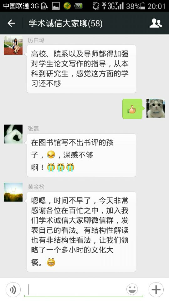 微信作为一种社交平台,既方便网络交流,也方便学习。社会学系研会充分利用微信这一新媒体平台,在大家闲余之时,新建“学术诚信大家聊”微信群,发动全系研究生参与此次群聊活动。我系研究生于11月16日晚上七点到八点间,积极参与此次“学术诚信大家聊”活动,并邀请其他院系同学参与。有同学就学术不端产生的原因或对策进行分析,也有的同学就群主提供的学术不端案例材料发表自己见解,观点或新颖独特,或真切深刻,在短短一个多小时内,大家借助微信群聊这一公共平台,发表自己对学术诚信的真切感受,有效的加深了我们研究生对诚信的理解,对学术的追求。