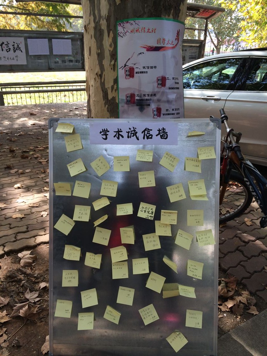 每位参与活动的同学在研会工作人员的引导下,在“学术诚信墙”上面书写自己的心愿,一张张黄色小卡片寄托了同学们对诚信的坚守,对学术的渴望。风吹动卡片,中午时分,学术诚信墙头早已携字满。