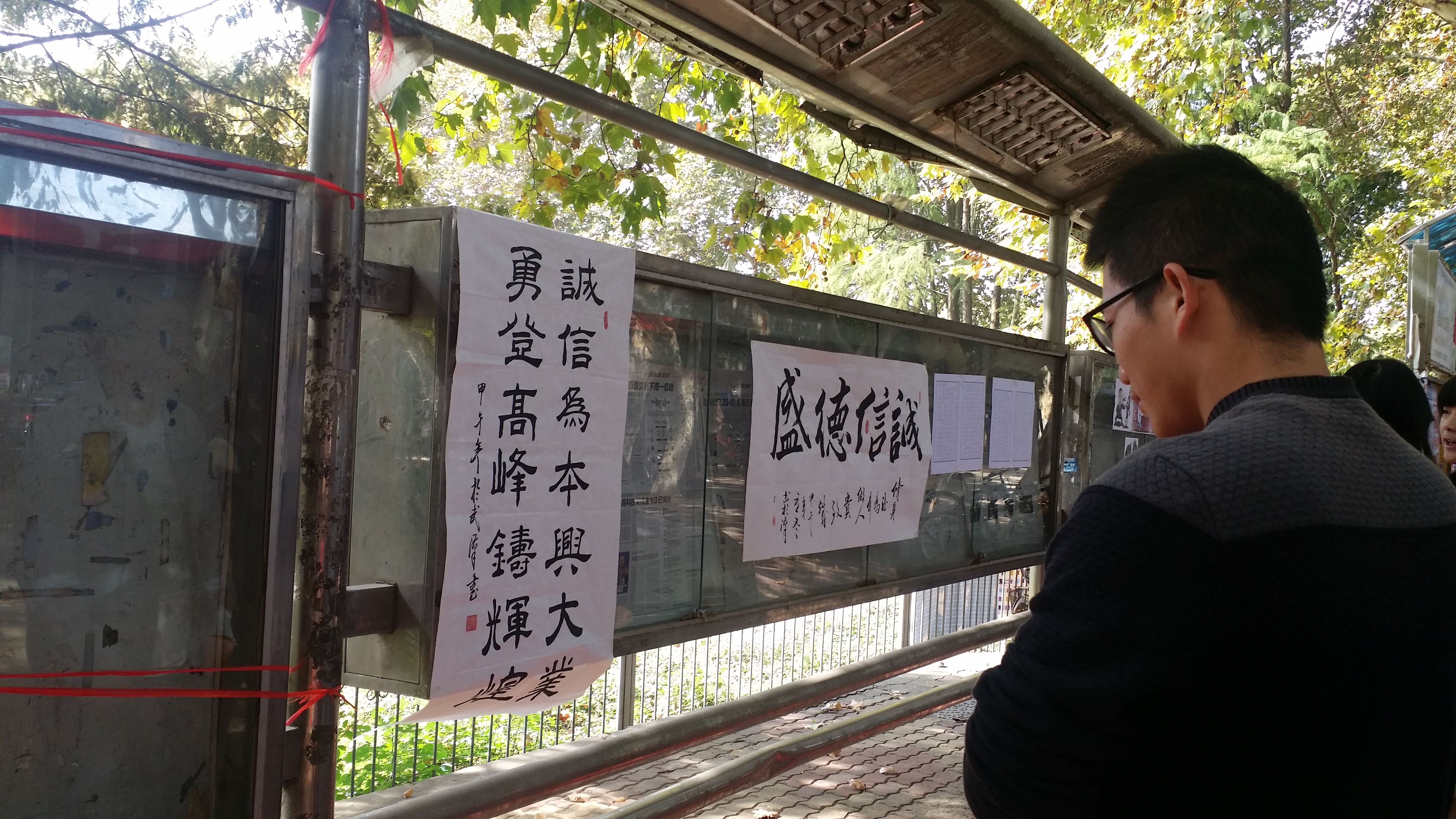 诚信是一种精神,更是一种风尚。社会学系研会充分发挥文科院系的自身优势,在沁苑宣传栏充分展示了与学术诚信主题相关的毛笔、硬笔书法和彩色漫画等征集的学生作品,吸引了不少学生驻足观看,在欣赏书法的同时,领略学术诚信的魅力。
