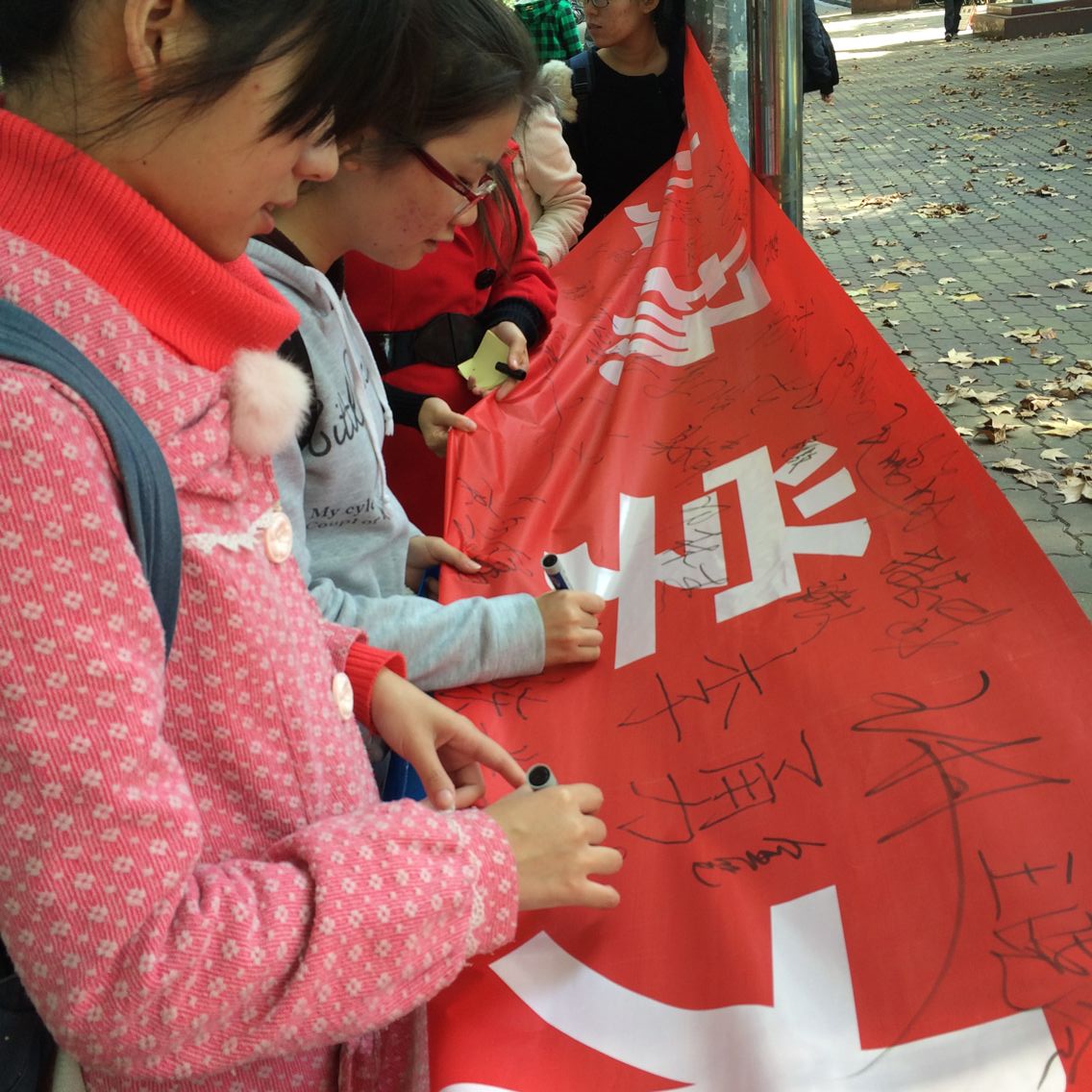 在“弘扬学术诚信,捍卫学术净土”的红色签名横幅上面,每位路过的同学或仔细观看学术诚信倡议书拍照,或坚定的在横幅上面签上自己的名字,表明对学术诚信的坚定信念。