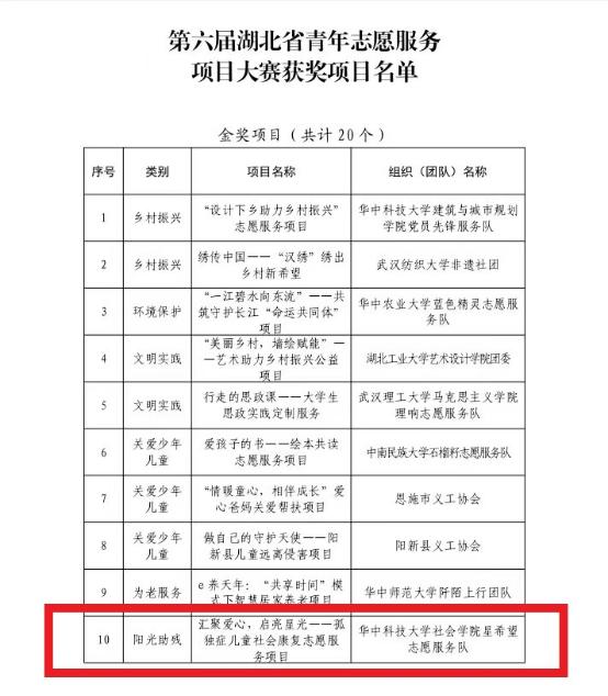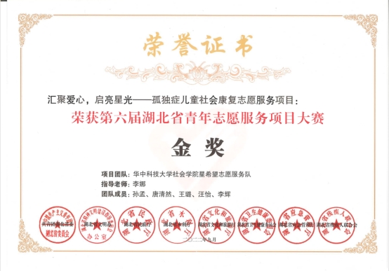 第六届湖北省青年志愿服务项目大赛决赛于9月17日顺利举办。我院“汇聚爱心,启亮星光”——孤独症儿童社会康复志愿服务项目(以下简称项目),在比赛中表现优异、脱颖而出,最终荣获第六届湖北省青年志愿服务项目大赛金奖!