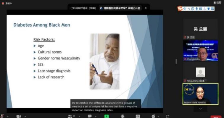 美国密歇根大学社会工作学院Jaclynn Hawkin副教授报告的题目是《Community-based Approaches to Diabetes Self-Management》,研究分享了基于社区的“糖尿病”的自我管理方法,以一项干预研究:密歇根州男性糖尿病项目(MenD)为例,首先从之前的“peer leader”试验中改进干预措施,使其适合患有T2D的黑人男性需求。其次,根据从Aim学习到的知识对该类黑人男性进行试点随机对照试验。最后,对同行主导的DSMS实施情况进行定性过程评估,以确定干预措施的可行性和可接受性,展示了MenD项目的成果与措施。同时,介绍了MenD2(R21)的具体阶段和项目短期、长期目标。