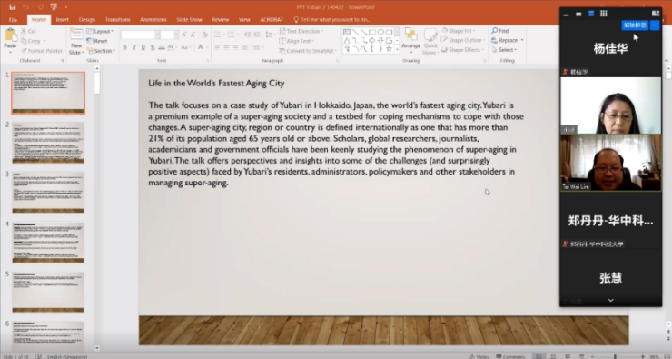 新加坡国立大学东亚研究所教授Lim Tai Wei的发言题目为《世界老龄化最快城市的生活:日本北海道Yubari的案例研究》,探讨了日本社会如何应对老龄化的问题。研究发现Yubari通过经济、政治、社会、社会福利和生活成本等方面共同发力来积极应对超级老龄化,取得了良好效果。