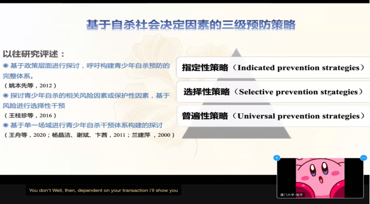 厦门大学社会与人口学院副教授常青松和研究生施宇报告题目是《青少年自杀风险的社会预防及其路径选择》。该研究诠释了我国青少年自杀的风险态势及其危害,并在梳理青少年自杀社会决定因素的基础上,提出社会预防概念并对现有研究进行系统评述。研究指出,要针对我国青少年建立“普遍性-选择性-指定性”三级自杀预防体系,在家庭、学校和社会场域分别采取不同的路径,利用技术的智能性、高效性与可靠性以实现家校社协同预防。