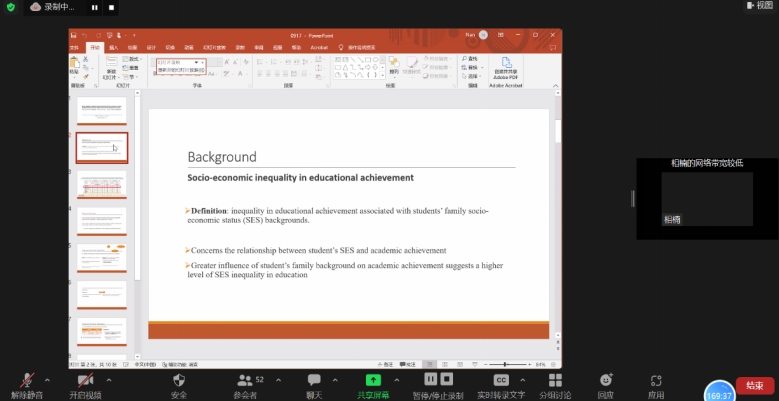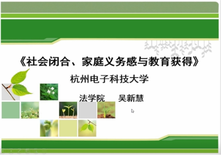 杭州电子科技大学吴新慧副教授的发言题目为《社会闭合、家庭义务感与教育获得》。研究通过“浙江省青少年教育发展”数据探讨了家庭社会闭合和家庭义务感对子女教育获得的影响及其城乡、内外的差异。研究发现:(1)家长学业参与会负向影响城市一般和省内随迁子女的学业成绩,且负向影响在城市一般组更大;(2)家庭代际闭合会影响城乡子女的教育获得,尤其是省外随迁子女影响最大,省内随迁其次;(3)亲子沟通会影响城乡青少年的学业成绩,但其影响力在城市一般组中较大,在农村三组中均非常弱;(4)家庭义务感是亲子沟通影响子女学业的中介变量,但家庭义务感并不能改变农村子弟在教育获得中的劣势。