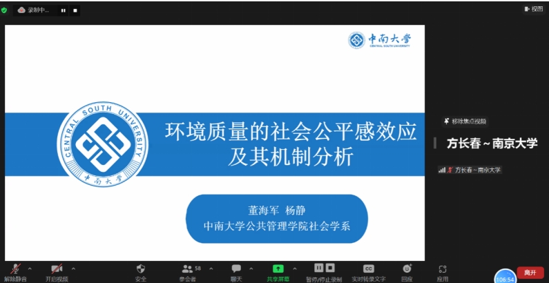 中南大学社会学系董海军教授的发言题目为《环境质量、地方政府信任与居民的社会公平感》。该研究利用CSS2019数据,分析居民所处的环境质量对其社会公平感的影响及其内在影响机制。研究发现,环境质量通过地方政府信任的中介作用影响居民的社会公平感,并且地方政府的环境治理水平正向调节了环境质量对居民的地方政府信任的影响和环境质量对居民社会公平感的影响。研究结果阐明了环境质量对居民社会公平感影响的路径,地方政府应当提高环境治理水平,加强环境治理能力建设,改善环境质量,增强居民对地方政府的信任,提升居民的社会公平感以保障社会和谐与稳定。