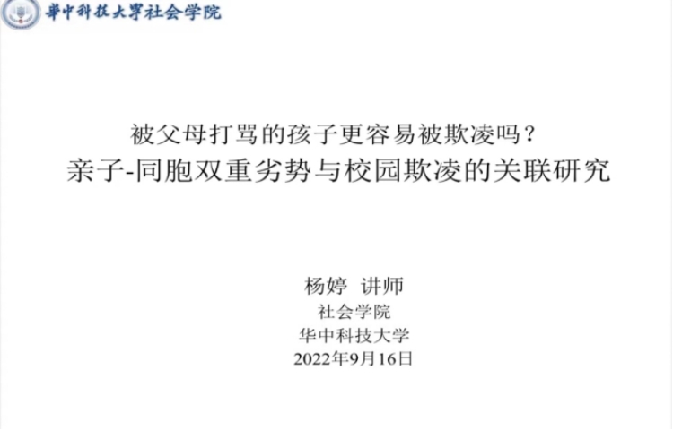 OK138太阳集团杨婷老师的发言题目是《被父母打骂的孩子更容易被欺凌吗?亲子-同胞双重劣势与校园欺凌的关联研究》。研究通过“2018年北京市学生常见病和健康影响因素调查”数据,探讨了家长暴力对校园欺凌的影响,并对“家庭-学校”场域下人际暴力的联动机制及其作用进行了验证。研究发现:(1)家庭结构、有无兄弟姐妹对学生经历校园暴力的影响具有差异性;(2)遭受家长暴力频率与校园欺凌的比例存在显著正相关关系;(3)基于劣势扩散理论,在家庭中处于“被打骂”的劣势身份会扩散到学校场域下“被打骂”的劣势身份,从而经历家长暴力的青少年遭受校园欺凌的风险增加。