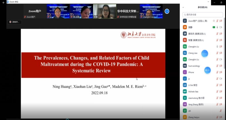 北京大学公共卫生学院郭静副教授报告的题目是《The Prevalences, Changes, and Related Factors of Child Maltreatment during the COVID-19 Pandemic: A Systematic Review》,研究首次对新冠肺炎大流行期间儿童虐待的患病率、危险因素和保护因素进行系统综述。通过对纳入的35篇文章进行分析发现在新冠肺炎疫情期间,儿童虐待中身体虐待、心理虐待、忽视和性虐待等不同类型的发生率分别为0.1% -71.2%、4.9% - 61.8%、7.3%-40%和1.4%-19.5%。虐待儿童发生率有所减少,但严重虐待儿童的发生率有所增加,这可能是受到封锁措施及其副作用的影响。该研究呼吁采取有针对性的措施,防止新冠肺炎期间以及当前和未来的封锁期间的儿童虐待的发生,并在美国以外的国家开展 进一步的研究。