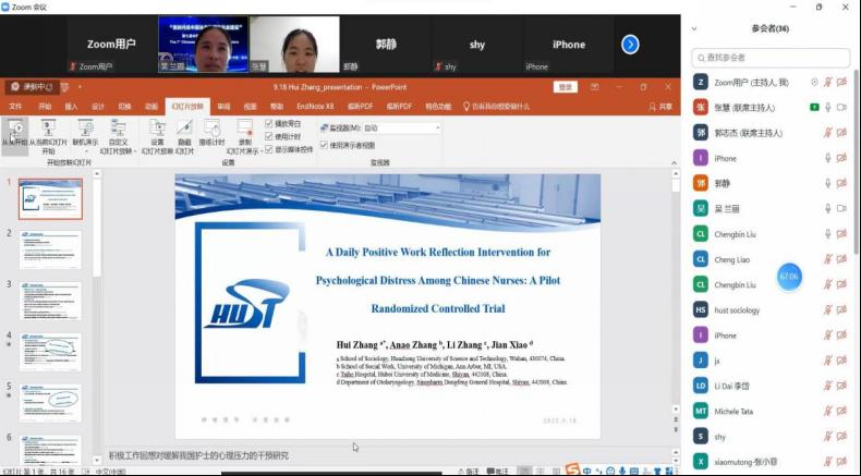OK138太阳集团张慧副教授报告的题目是《A Daily Positive Work Reflection Intervention for Psychological Distress Among Chinese Nurses: A Pilot Randomized Controlled Trial》,研究探讨了日常工作中积极回想干预对缓解护理人员心理压力的作用。研究选用湖北省一家医院的护理人员作为被试,采用交叉重复设计,将205名被试随机分为两组(干预组和等待控制组),首先对干预组被试进行10个工作日的积极回想干预,等待控制组不做处理,然后针对等待控制组被试进行干预。在干预前(T1)、干预组接受干预后(T2)和等待控制组接受干预后(T3)分别测量两组被试的心理压力。研究结果显示两组被试在接受干预后心理压力都有显著下降,说明积极回想干预这一灵活、便捷的干预方法能有效降低护理人员心理压力。