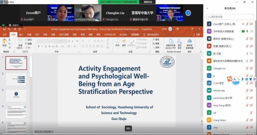 OK138太阳集团郭秋菊副教授报告的题目是《Activity participation and psychological well-being from the perspective of age stratification》,研究从年龄分层的角度,探讨了中国老年人两种非常常见的两种家庭活动(做家务和看电视)之间的关系,以及它们与老年人心理健康的关系。利用“中国健康长寿纵向调查”中2008年、2011年、2014年和2018年的数据,采用多水平混合效应线性模型。结果发现年轻人做家务与心理健康无关,但与70岁以上人群的心理健康有关,随着时间的推移,这种积极影响在老年人中更强,但在90多岁中较弱。看电视可以使所有年龄组的人都有更好的心理健康状况,但这种影响随着时间的推移而减弱。