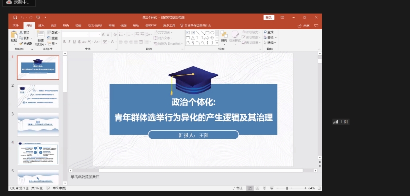 华东理工大学马克思主义学院王阳老师的发言题目为《政治个体化:青年群体政治参与行为的失范风险及其治理》。研究从青年群体现实政治参与消极而网络政治参与积极的行为悖论提出研究问题,研究发现人大代表换届选举的工作过程折射出部分青年群体的政治个体化趋势,青年群体在政治参与中更加重视个体的现实体验,会通过个性化行动反抗过强的组织控制并演化为戏剧性的公共生活以消解现实政治活动的严肃性。人大代表选举既是行使人民当家作主权利的重要方式,也是培育公民政治参与意识的机会,进一步促进日常政治活动与思想政治教育的结合,激发青年群体参与现实政治生活的热情,对于推动和完善社会主义民主政治具有重要意义。