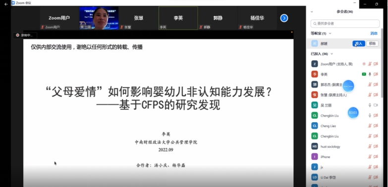 中南财经政法大学公共管理学院李英副教授报告的题目是《“父母爱情”如何影响婴幼儿非认知能力发展?》,研究利用2018-2020年中国家庭追踪调查数据探讨了父母婚姻对1-3岁婴幼儿非认知能力的影响及机制。研究发现父母自评婚姻不满意时,婴幼儿负面情绪表达更为激烈。父母的抑郁水平是影响父母婚姻满意度与婴幼儿非认知能力的重要机制,而亲子互动频率的机制不成立。进一步分析发现,当婴幼儿年龄在1岁时、父母受教育程度为中等及以下时,婴幼儿非认知能力受父母婚姻的影响更大,而且母亲自评婚姻满意度的影响要明显强于父亲。