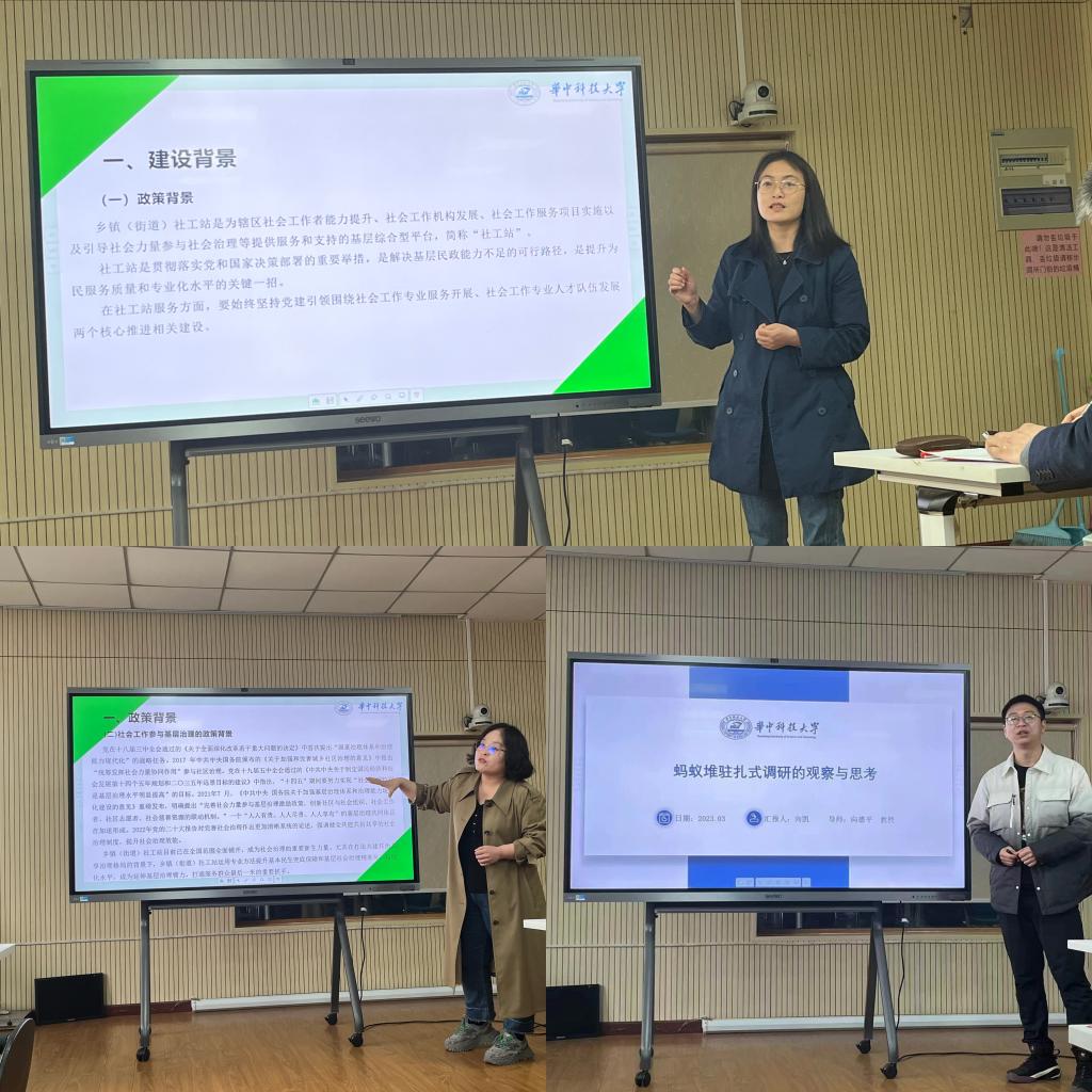 我院社会学专业三名博士生分别汇报了在蚂蚁堆村驻扎并开展实践与研究工作的情况。谢琼彦结合实际案例,就蚂蚁堆村社会工作服务室的建设路径及开展乡村振兴行动研究的情况做了汇报;王利娜讲述了新时代文明实践所(站)与乡镇社会工作服务站(室)融合的过程及开展农村基层社会治理实践研究的情况;向凯则向与会人员介绍了驻扎式调研的开展情况并分享了所见所感。三位博士生汇报内容丰富、理论与实践密切结合,吸引了与会人员的高度关注。