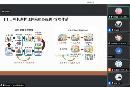 韩国高丽大学老龄社会研究院研究员何妨容做了题为《日韩长期护理保险服务提供、管理体系与启示》的报告。她提出在中国老年家庭空巢化不断加剧的背景下,夫妻空巢老人这一现象应引起学界重视和政府投入。为此,我国居家照护服务应明确老年人夫妇家庭照顾问题的重要性并由以个人为单位的保险体系转变为以家庭为单位的保险体系,具体而言可以通过两种路径:路径一为将生活支援定位到“保险”方式(自行选择服务);路径二为将生活支援定位到“福祉”方式。
