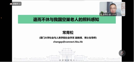 厦门大学副教授常青松分享的题目是《退而不休与我国空巢老人的照料感知》,提出将主体性与脆弱性都考虑在内的“照料感知”概念,并分析了不同维度下的退而不休是否会对空巢老人的照料感知产生影响以及会产生怎样的影响,及空巢老人退而不休与照料感知的关联是否在不同的代际互动下表现出显著的差异两个问题。接下来常青松副教授介绍了研究设计的数据来源与样本选择、变量选择、模型设计,以及实证分析的描述性统计、基准回归与代际互动的异质性分析,并提出了结论和政策建议。