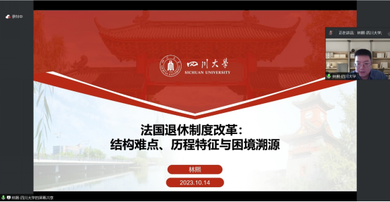 四川大学副教授林熙作了题为《法国退休制度改革:结构难点、历程特征和困境溯因》的报告,他从退休制度及其利益结构引入,从制度结构,利益矛盾、发展历程和“法式困局”四个方面对法国退休制度改革进行分析,指明法国退休制度实质上经历的是一个从养老金碎片化治理到全面延迟退休的环环相扣、层层递进的过程,进而归纳出法国退休制度改革的基本特征以及导致法国退休制度改革困境的核心原因;并以法国为借鉴对我国退休制度改革提出了退休改革的终极目标是重构老龄生命历程,最终指向多元化的老龄人力资本发展等政策建议。