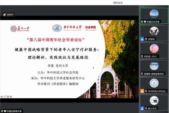 浙江红船干部学院的吴雯淇老师汇报题目为《数字赋能居家社区养老服务的机制探索》。吴老师先以数字治理理论以及福利多元主义理论为理论介入,主要介绍了浙江省嘉兴市秀洲区根据老年人群多样化的服务需求,探索实施“家院融合·养医护智慧康养”服务模式,构建了集康养、医疗、护理和居家照料为一体的秀洲“安心养”应用场景;从平台重塑机制、资源优化机制、线上+线下服务供给机制三部分对浙江居家社区养老服务模式进行了介绍。
