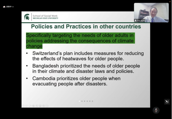 美国密西根州立大学孙飞教授作题为《The effect of the low carbon pilot program on the cognitive health of older Chinese》报告,他从气候变化的视角出发,对老年人社会脆弱性进行研究,提出气候导致的健康不平等问题,例如环境污染物、极寒天气、食物和饮用水可及性等问题。该报告的研究结合中国增加绿化等低碳行动来探讨低碳行动可以促进老年人户外的外出活动,促进老年人认知健康。最后,孙飞教授在应对未来气候变化和友好社会等方面提供了如何帮助老年人应对的一些政策干预和行动启发。