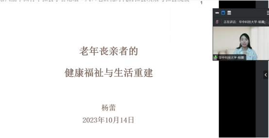 ok138cn太阳集团副教授杨蕾作了题为《老年丧亲者的健康福祉与生活重建》的报告,她指出与其他国家相比,中国的丧亲丧子者面对的创伤更具挑战性和摧残性,子女离世使得中国家庭不仅要面临家庭结构缺失、家庭关系颠覆和家庭功能受损的情况,还会使该群体的社会关系、社交网络遭受破裂,该群体也将永久性地处在社会结构不可逆转的边缘地位。她从丧亲哀伤相关的理论与模型有经典的依恋理论、假想世界理论和意义重建视角出发,针对老年丧亲者的意义与生活重建提出了基于结构化视角下的双程模型。