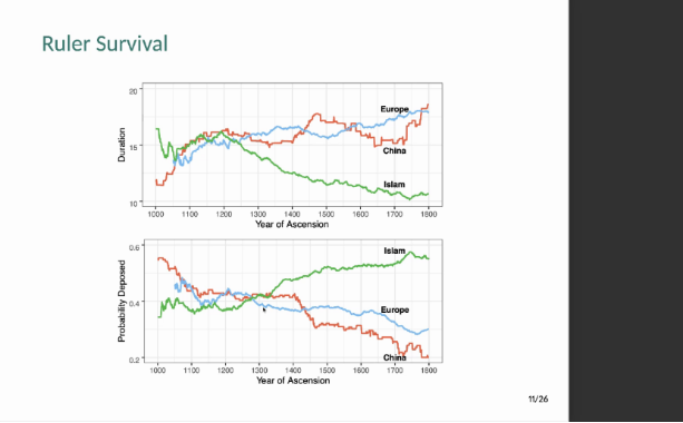 由气候变化导致的冲突就会引起古代中国国家发展的变化。唐代的网络结构可以用星状型结构来表示,因为当时的国家是由君主和士族共同统治。但到了晚唐时期,由于黄巢起义屠杀了门阀大族,导致原来的网络结构被摧毁了,因而推动了唐宋转型。由此,从宋代开始就大规模用科举考试来选拔官僚,科举把地方的乡绅精英选拔到了中央,这些地方乡绅跟唐代的那些全国性的士族是完全不一样的,这些地方乡绅有地方利益,他们只跟某个地方有很强的关系,并没有一个遍布全国的网络。所以从宋代开始中国就形成了领结型网络结构,这种领结型结构一直持续到鸦片战争爆发的时候。鸦片战争是一次影响深远的外敌入侵事件,它深刻地改变了中国国家和社会的关系,随后导致晚清出现了孔飞力(Philip Kuhn)指出的“地方社会的军事化”现象——在太平天国时期,咸丰皇帝需要地方的乡绅来组织军事组织团练用于镇压太平军,这个时期地方组织完全独立于国家的控制。杜赞奇(Prasenjit Duara)提出的“国家内卷化”也是同样一个过程。这样,晚清国家慢慢失去了对社会的控制,这种现象一直持续到1949年。这一阶段的中国都是处在这样一种指环型的网络结构当中。