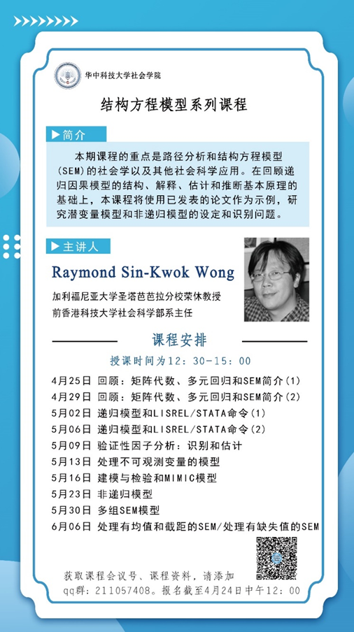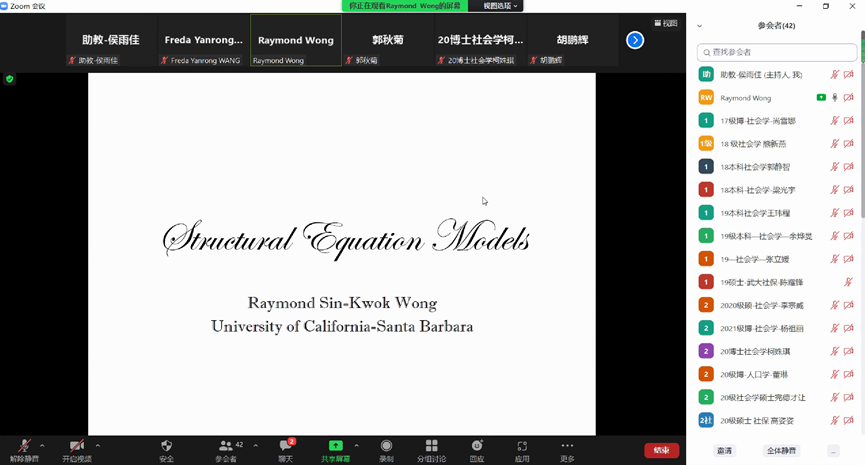 (通讯员 王彦蓉 侯雨佳)2022年6月6日,由OK138太阳集团应用社会经济研究中心主办的“结构方程模型系列课程”圆满结束。该课程受到国家外专计划的支持,特别邀请加利福尼亚大学圣塔芭芭拉分校荣休教授、香港科技大学社会科学部系前主任黄善国教授作为主讲人,与加利福尼亚大学圣塔芭芭拉分校课程保持了完全同步。为保证课程的顺利进行,研究中心特别设置了课程群及答疑群并安排了教学助理。来自ok138cn太阳集团、武汉大学、上海师范大学等多所高校的八十多名师生参与了此次学习。